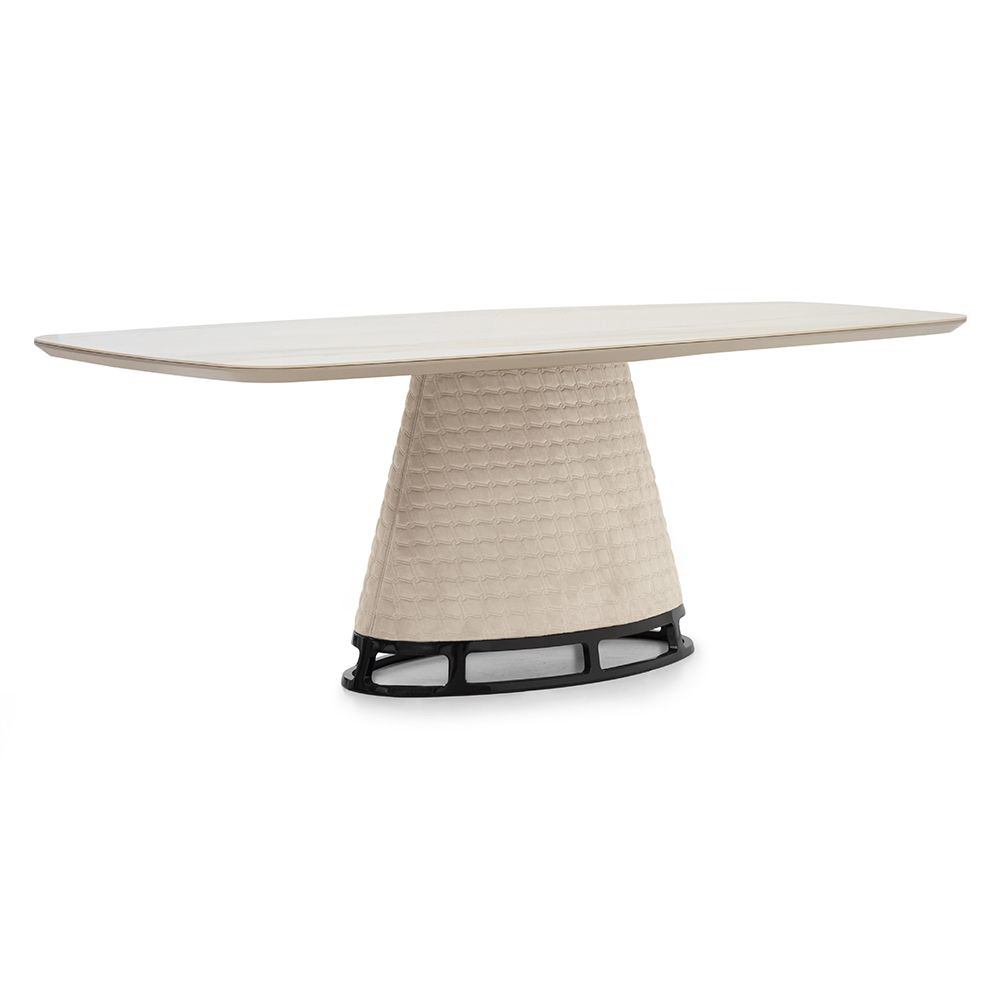 Rectangular dining table with ceramic marble top, cone shaped base upholstered in quilted technosuede, uniquely shaped base in metallic finish.
