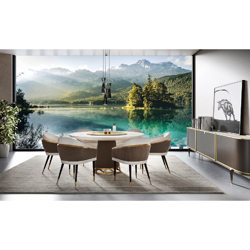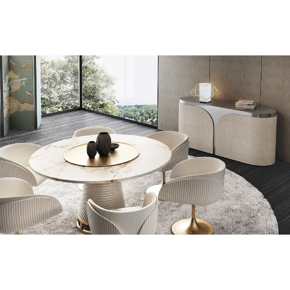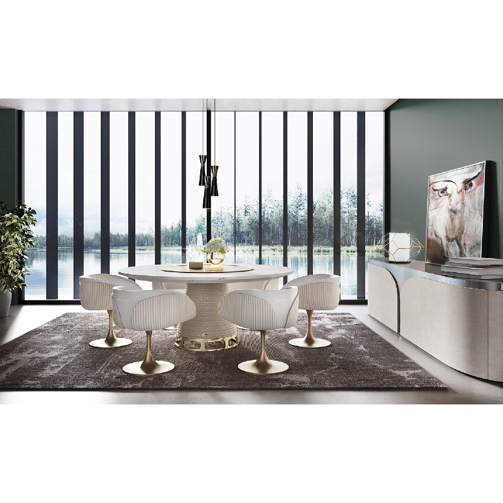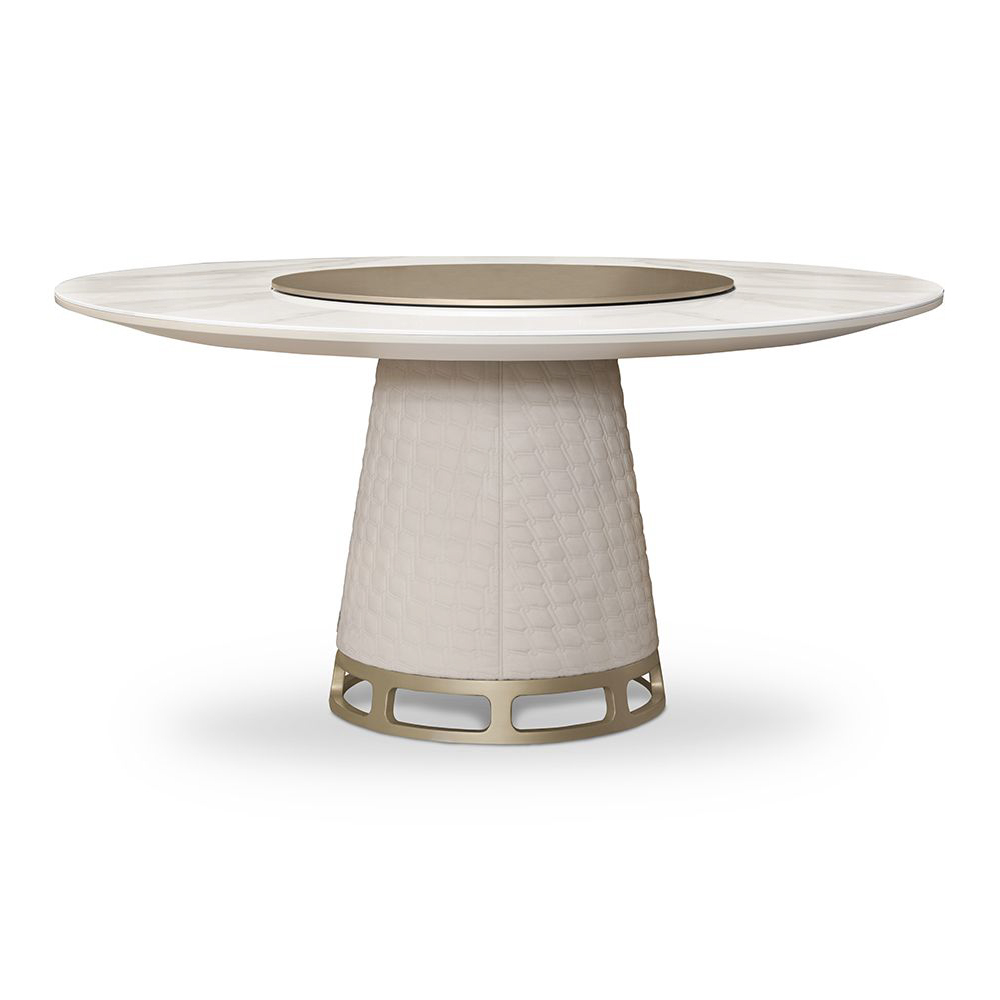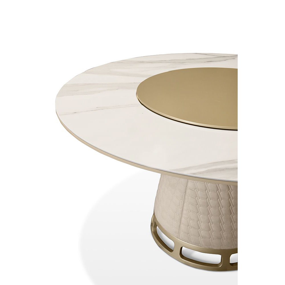 Round dining table with ceramic marble top provided split in two, cone shaped base upholstered in quilted technosuede, uniquely shaped base and lazy susan in metallic finish.