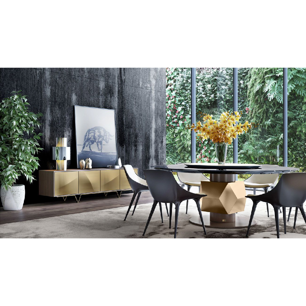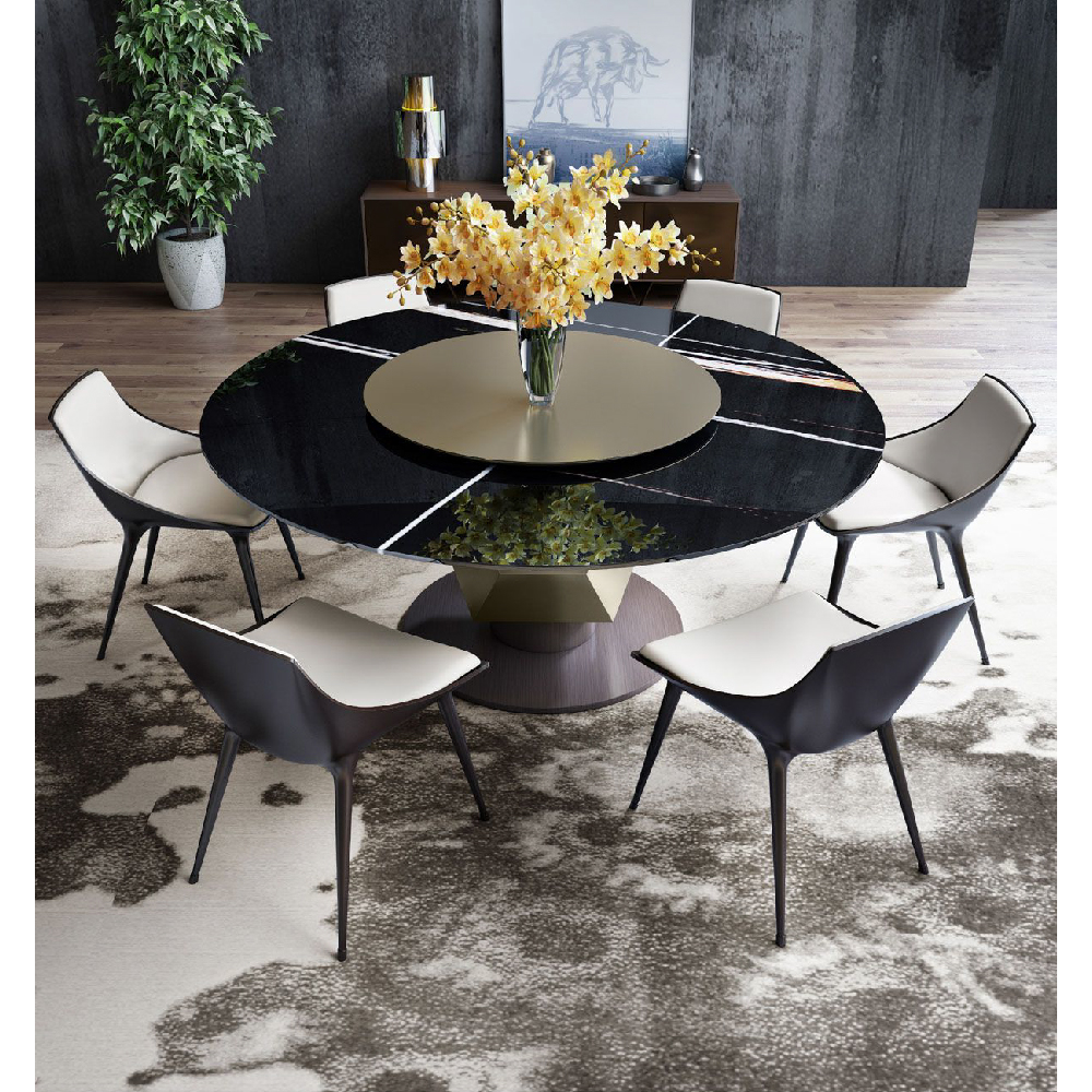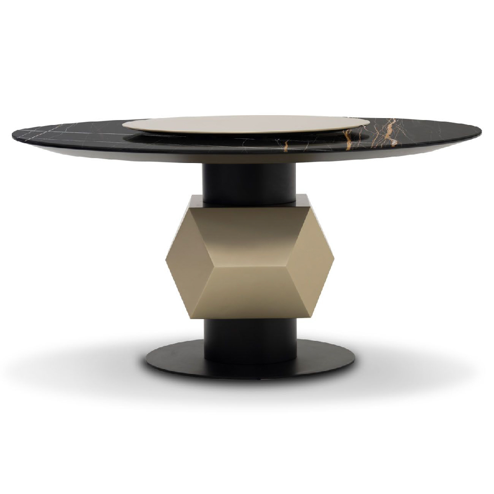 Round dining table with diamond insert. Ceramic marble top provided split in two, diamond insert and lazy susan in metallic finish, base plate and leg lacquered matt.