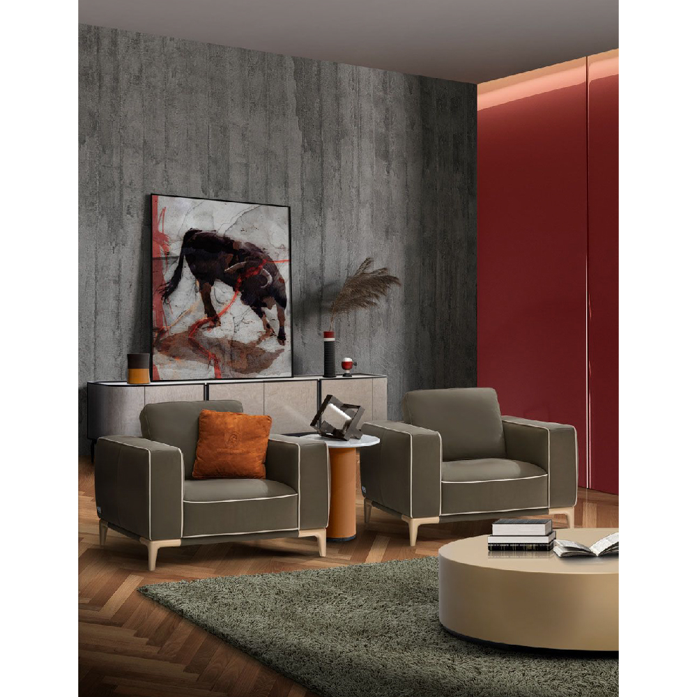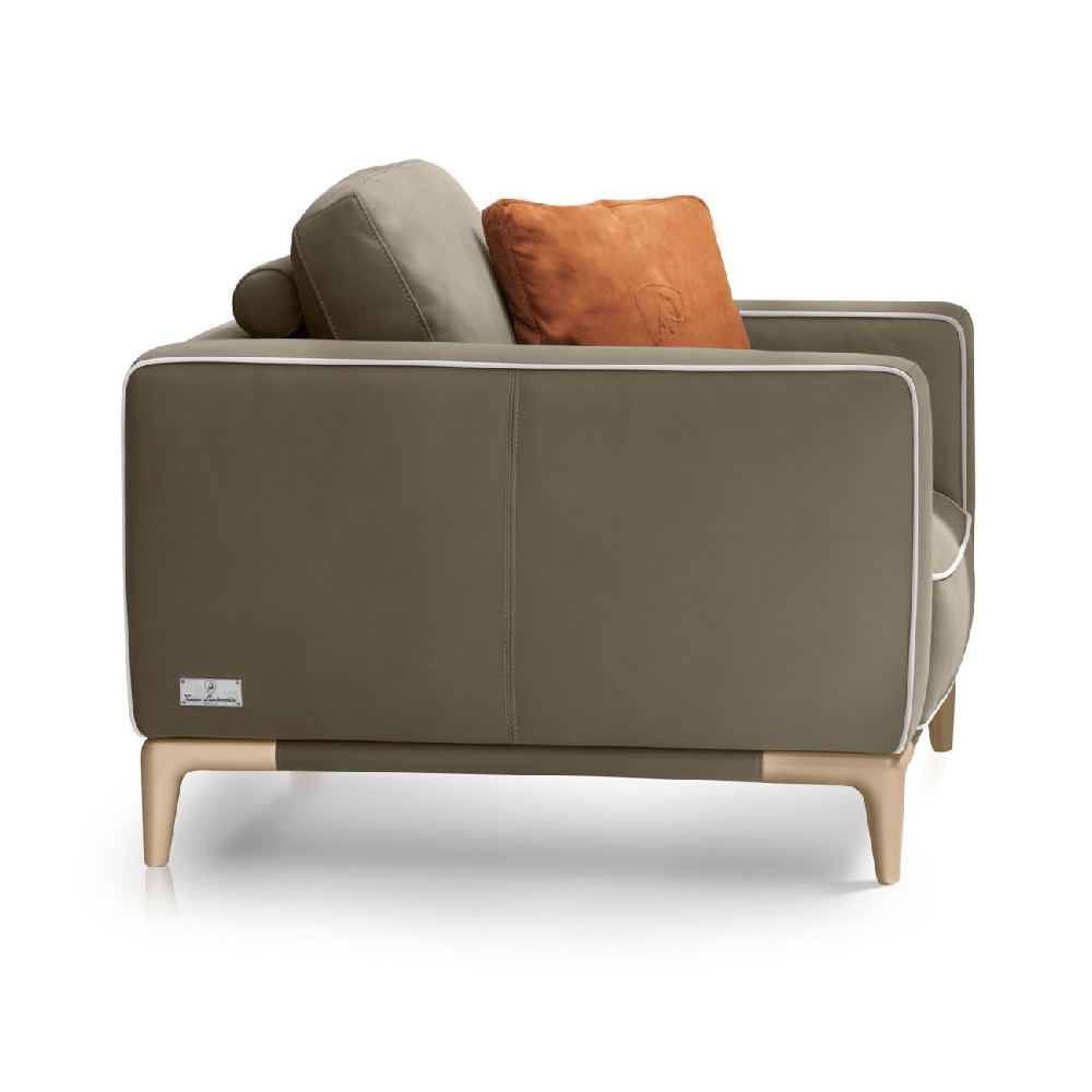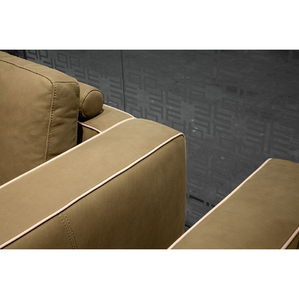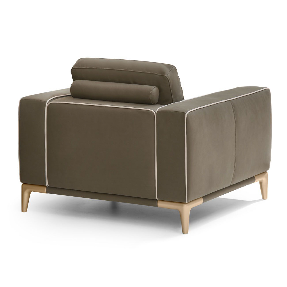All in leather Nobu col. Muschio, piping in leather Nobu col. Seppia, base upholstered in leather Nobu col. Muschio with legs lacquered col. Pale Gold.