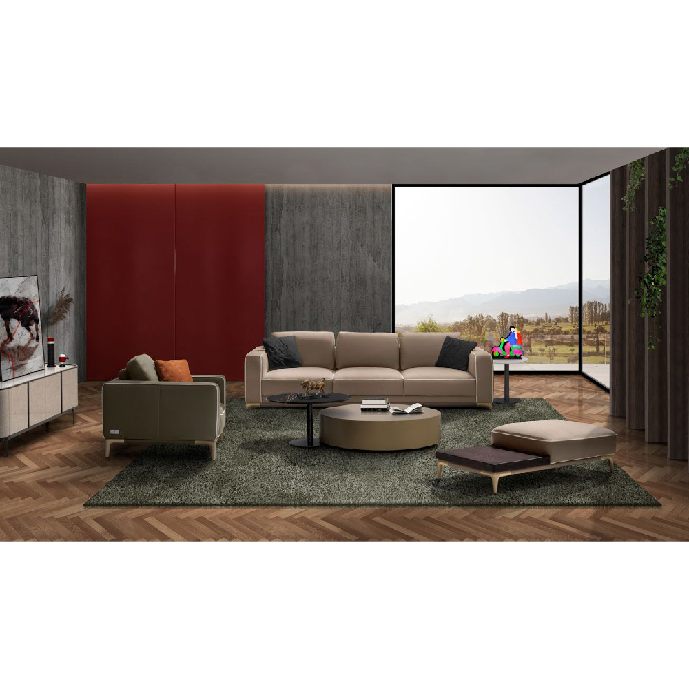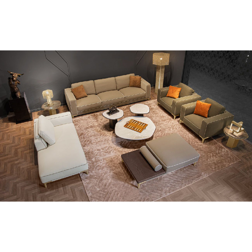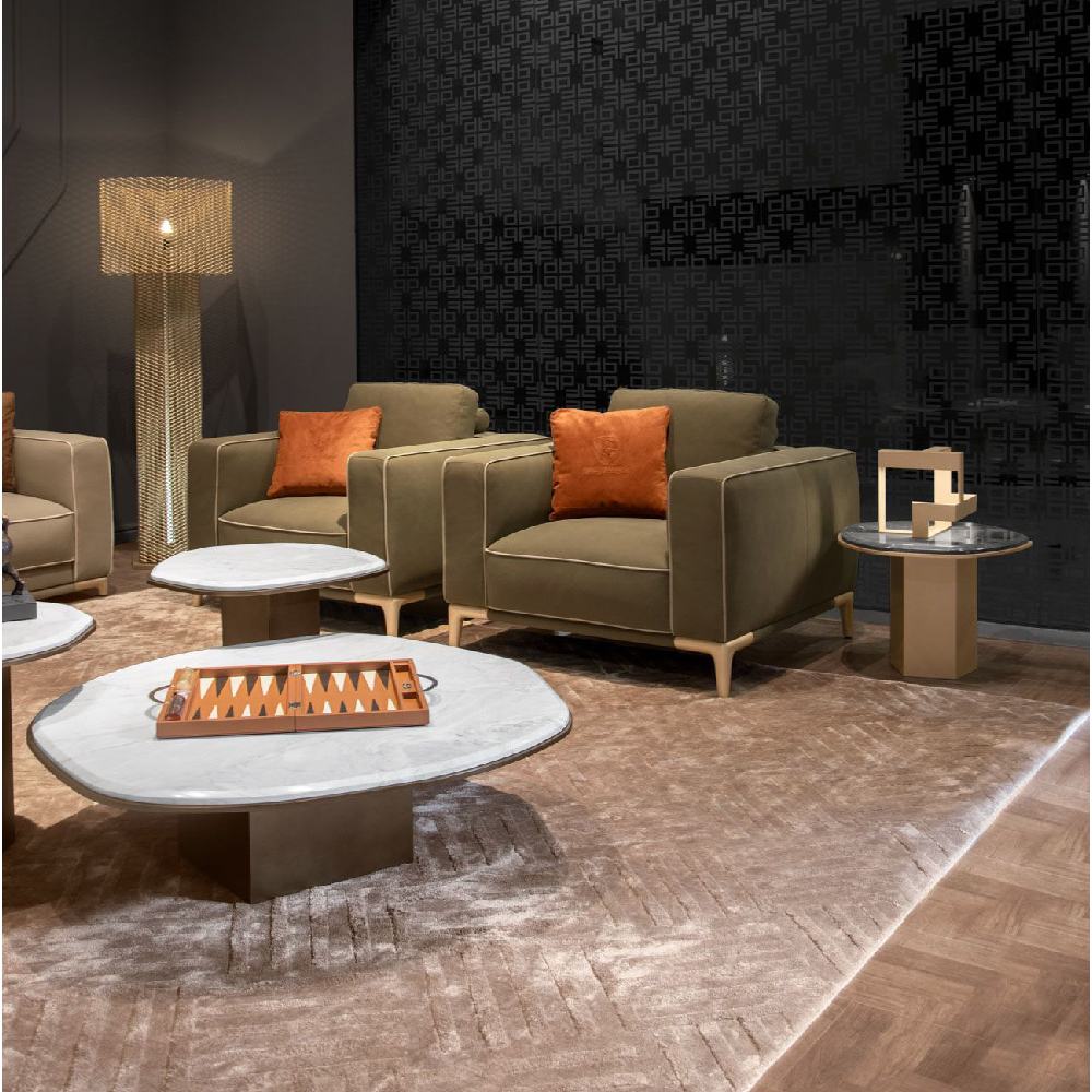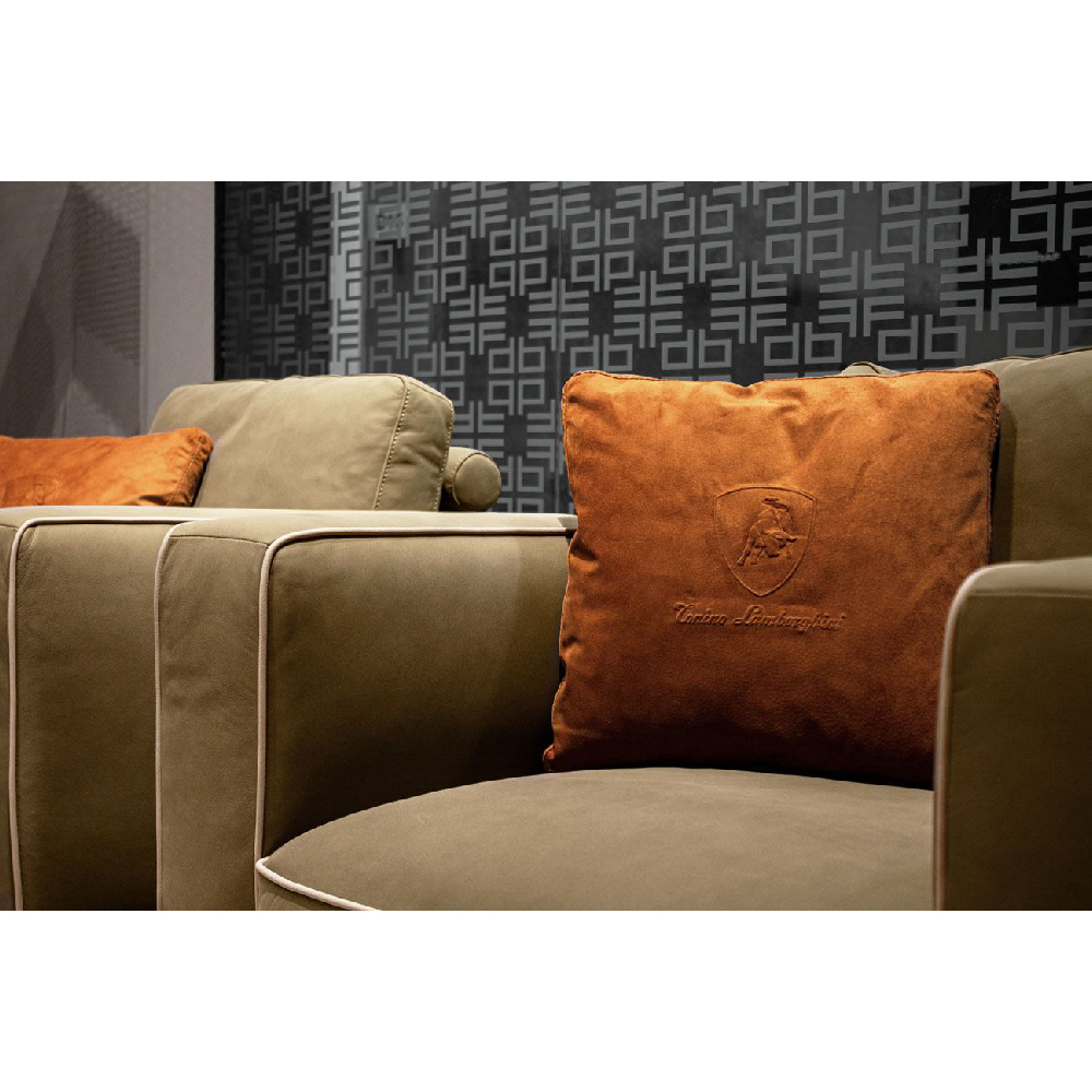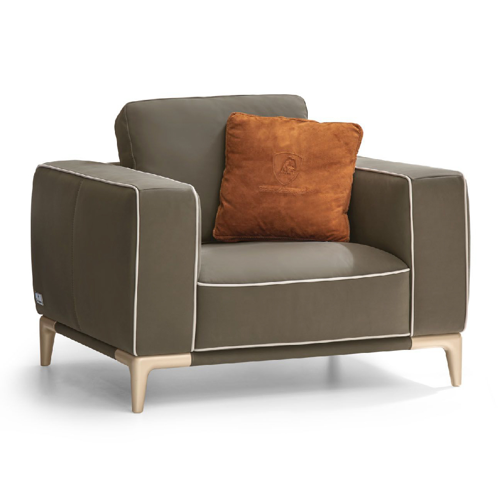 All in leather Nobu col. Muschio, piping in leather Nobu col. Seppia, base upholstered in leather Nobu col. Muschio with legs lacquered col. Pale Gold.