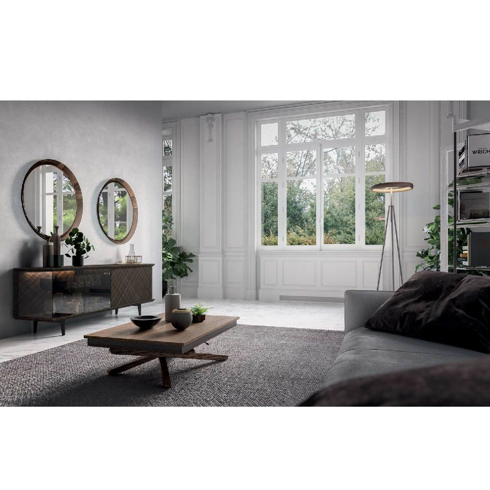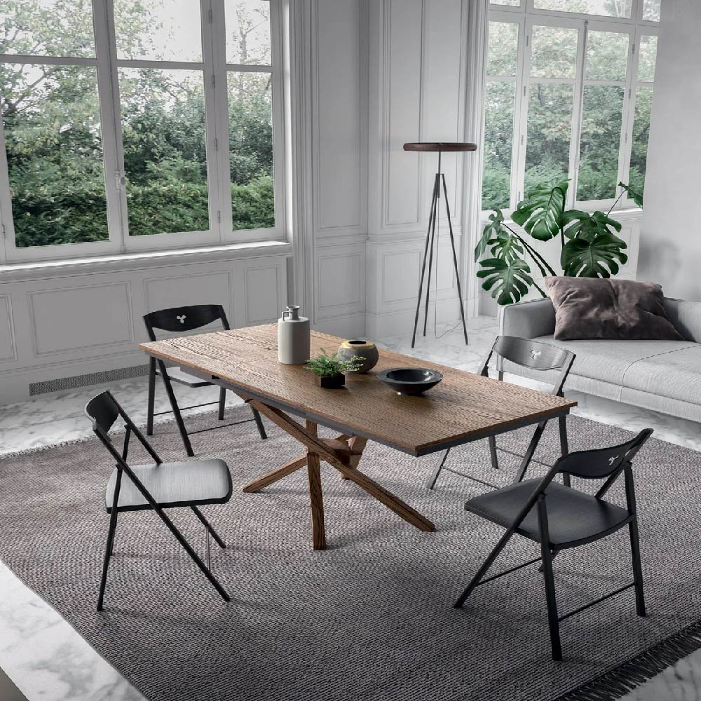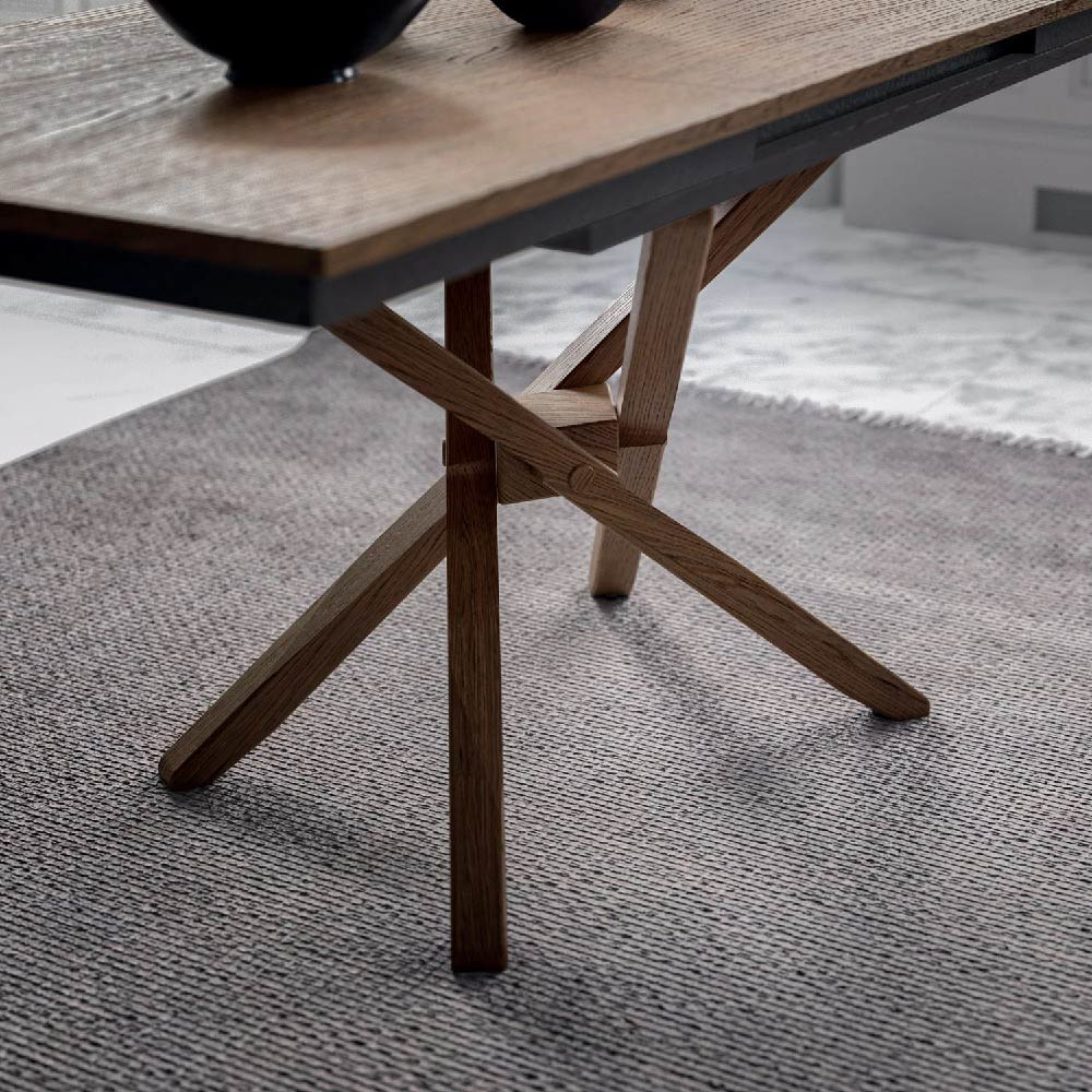 Jolly is a transformable coffee table with a crossed wooden base that blends into the living area thanks to the matching finish of the top. An ideal combination for convivial spaces, also given the ease of opening with extension hidden in the top that allows extension up to 177 cm.