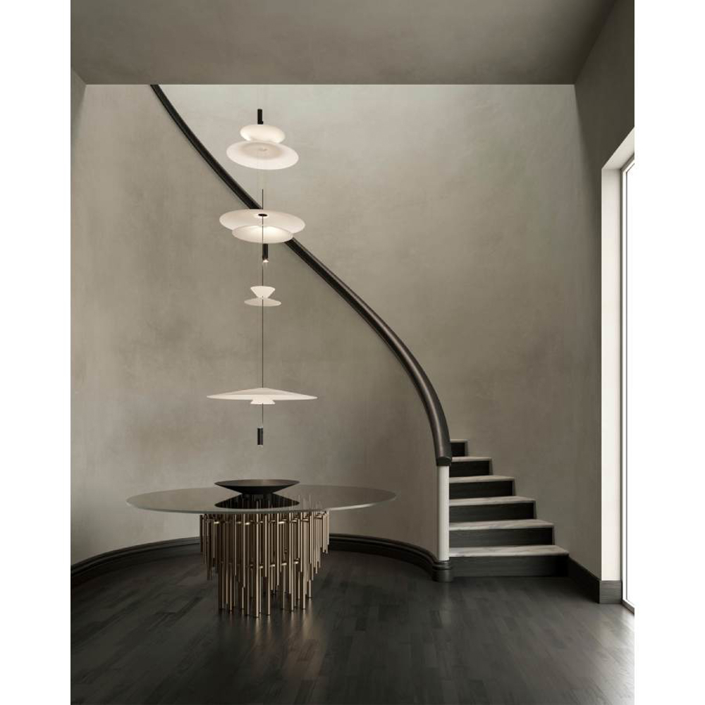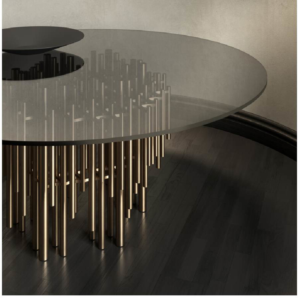 Tables, round or oval, with an exclusive and precious base. The construction elements that form the base are formed by a pair of shaped plates to which the vertical elements of various sizes are fixed. The plates are obtained starting from a single circular element, shaped with CNC technology and then finished by hand.