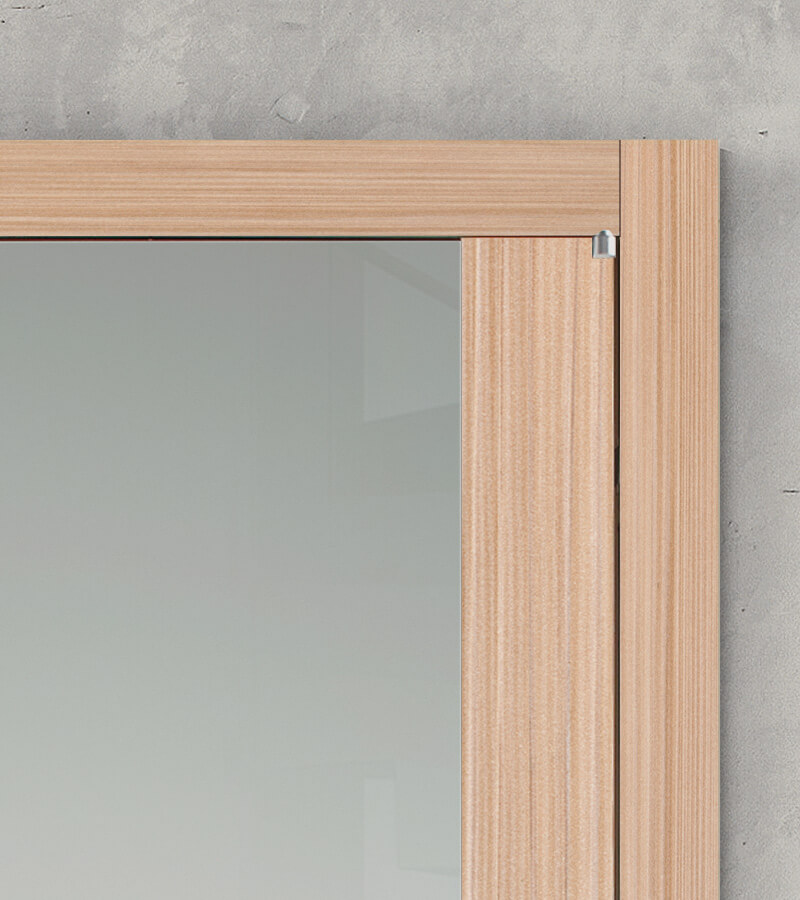 This collection has a linear look that is both simple and practical. It comes with a traditional frame or in a coplanar model. The wood-effect finishes decorate both modern and more traditional spaces.