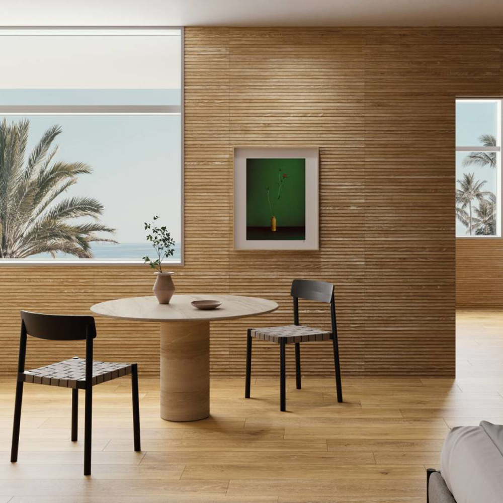 Peronda has created its Verbier Wall tiles to match the Verbier floor tile collection. Available in a 13"x40" format, the tiles emulate thin oak wood slats whose zigzagging surface casts small shadows that lend each one rhythm and depth. A perfect solution for rounding off living spaces and infusing them with warmth and harmony.