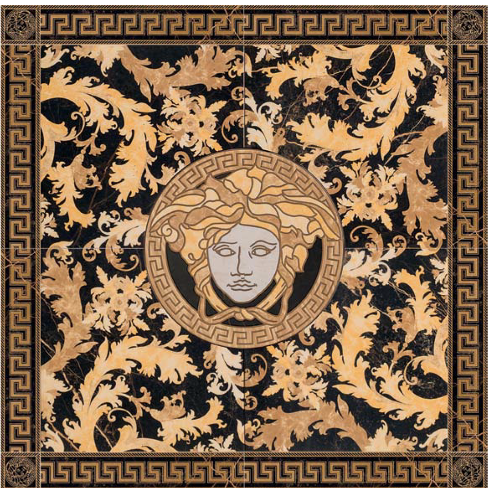 Colorful intertwined geometries Mosaics with mixed surfaces create plays of light and artisan decorations made with fine ceramic materials look after the details, enriching the Marble line with a vibrant, brilliant fascination, enhanced by the prestigious Medusa motif symbolic of Versace Ceramics style.