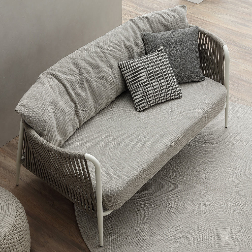 The unique, airy design of the chair, armchair and sofa of Versilia collection is perfect for exquisite moments of relax. The wrap-around back and armrests, made entirely out of rope, blend seamlessly and give each piece a contemporary yet timeless look and feel. The backrest cushions are designed for optimal seating comfort.
