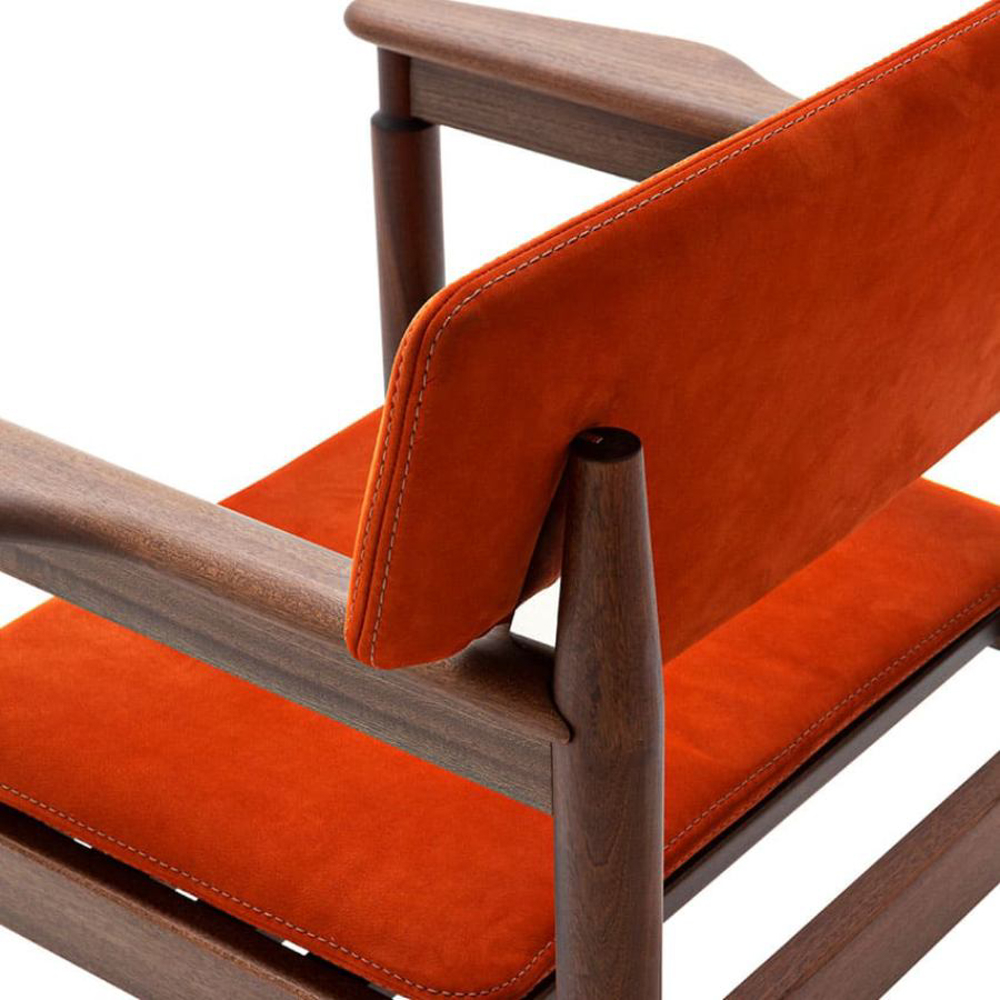 The backrest lines follow the classical echoes of nautical and vintage design style, smoothly jointing contrasting elements of the seat.