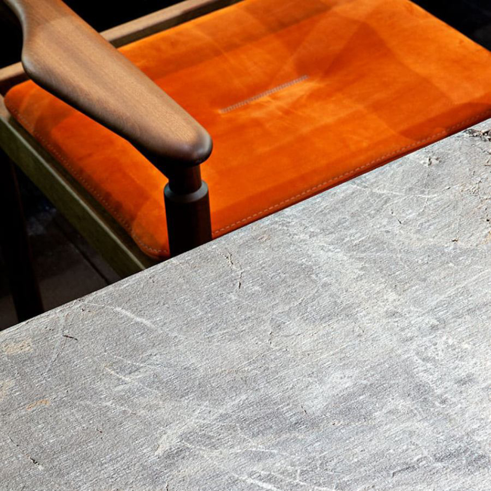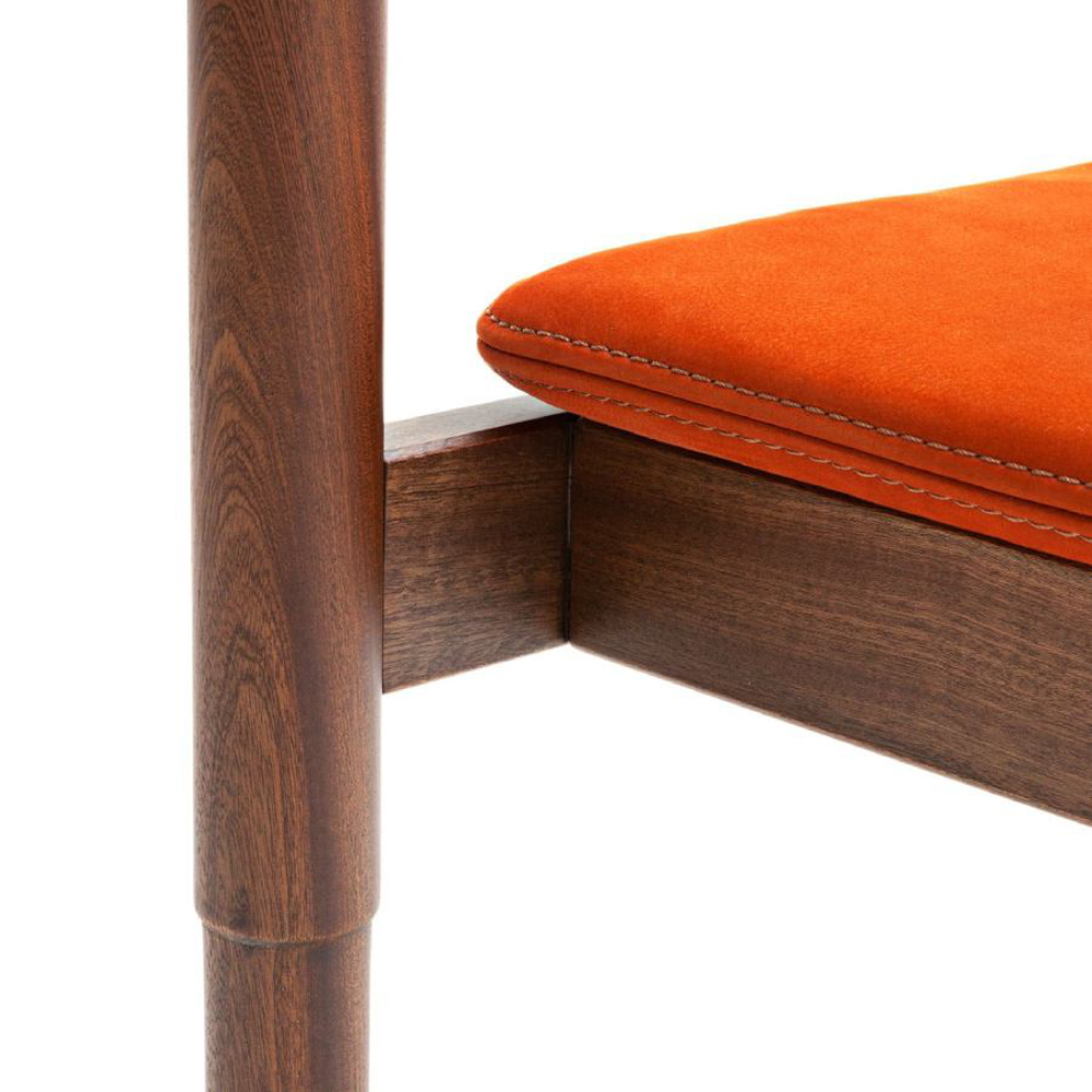 The needlework details are a precious gift enhancing the craftsmanship look of the seat, a feature that adds a sense of tradition deeply connected to its cultural roots. The stainless steel T-shaped feet enrich the design with a contemporary touch.