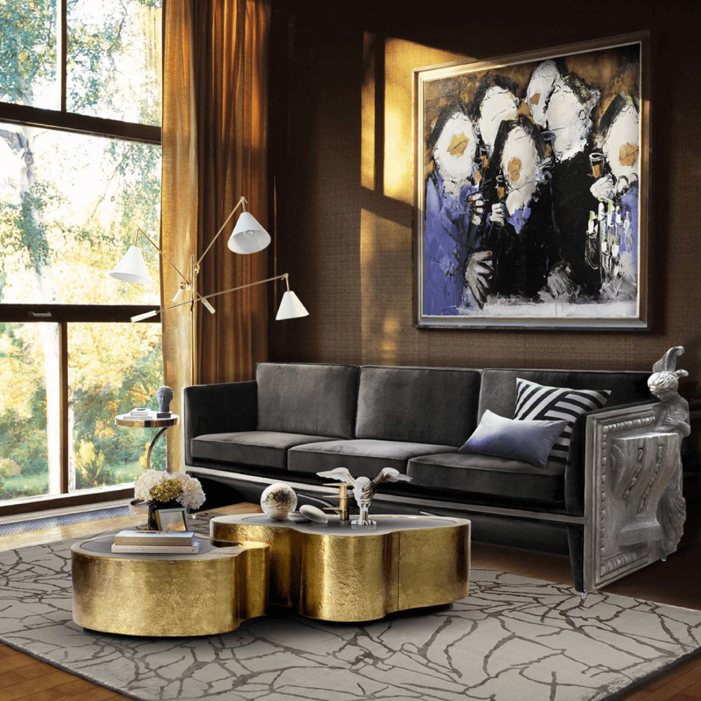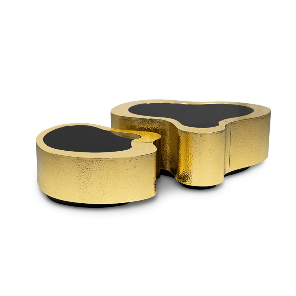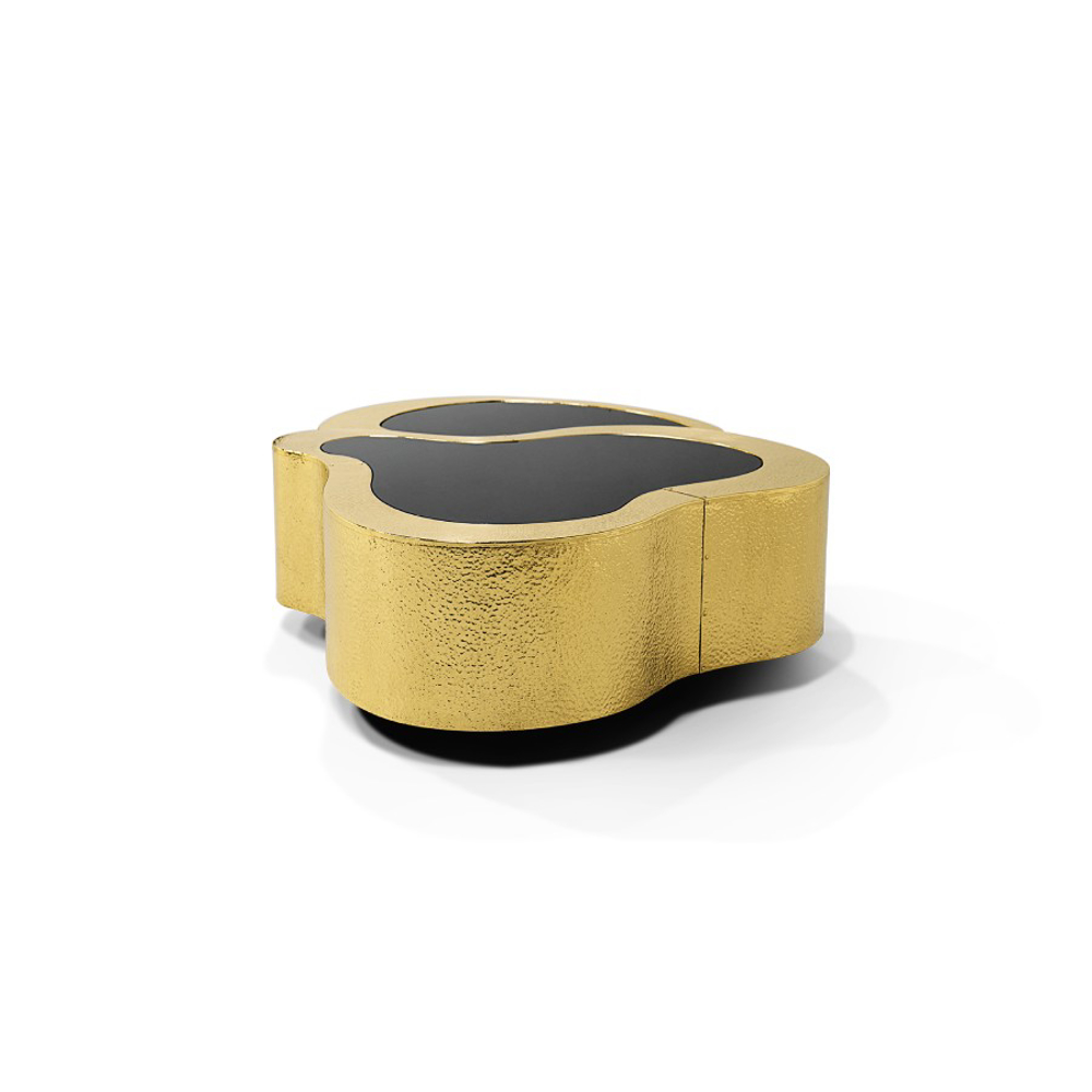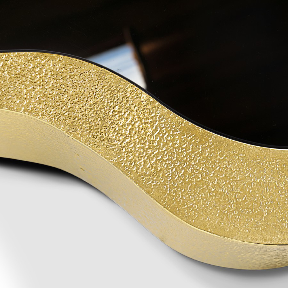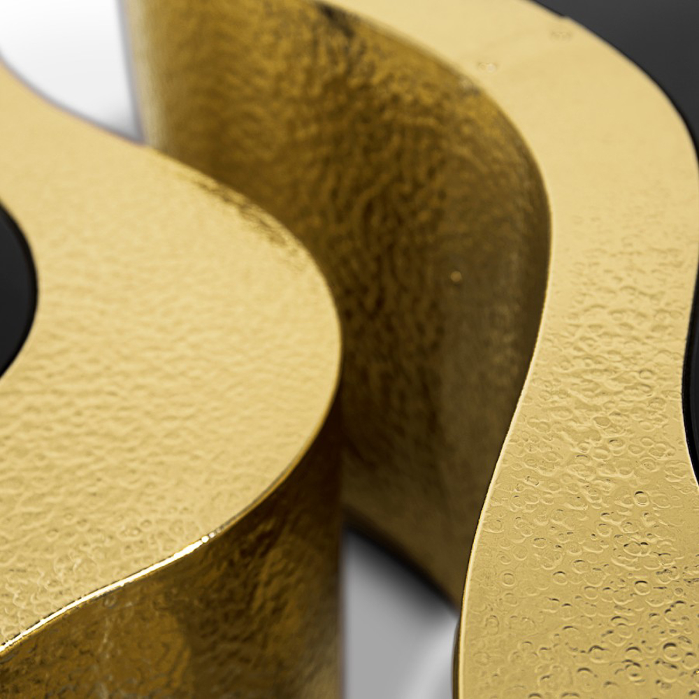 Table made in wood finished with manually hammered brass, with a curvilinear top made from black mirror. The base is lacquered in black finished with a high gloss varnish.