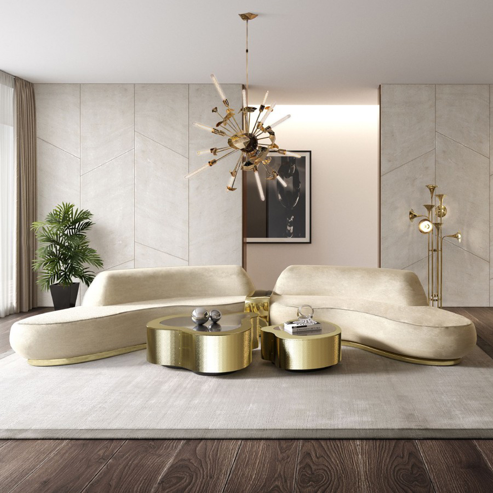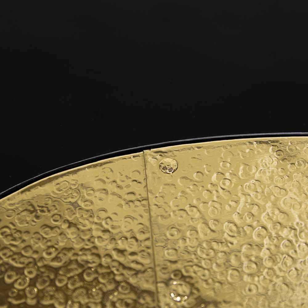 Table made in wood finished with manually hammered brass, with a curvilinear top made from black mirror. The base is lacquered in black finished with a high gloss varnish.