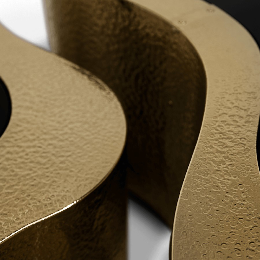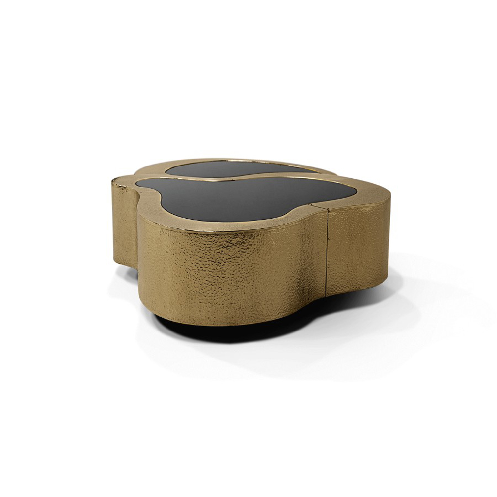 Table made in wood finished with manually hammered brass patina, with a curvilinear top made from black mirror. The base is lacquered in black finished with a high gloss varnish.