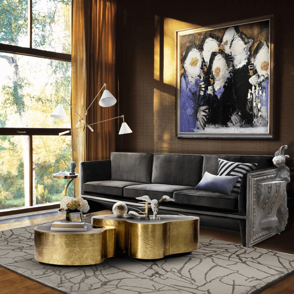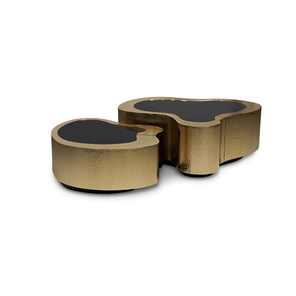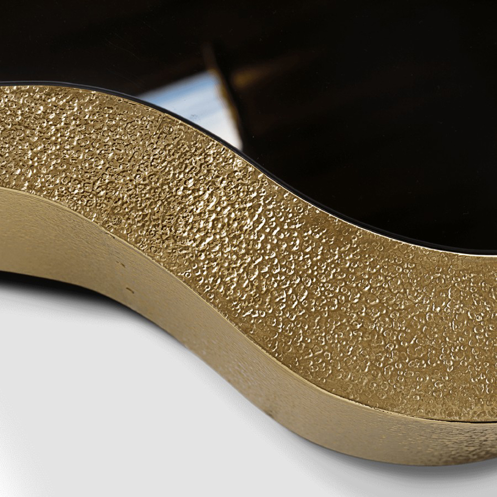 Table made in wood finished with manually hammered brass patina, with a curvilinear top made from black mirror. The base is lacquered in black finished with a high gloss varnish.