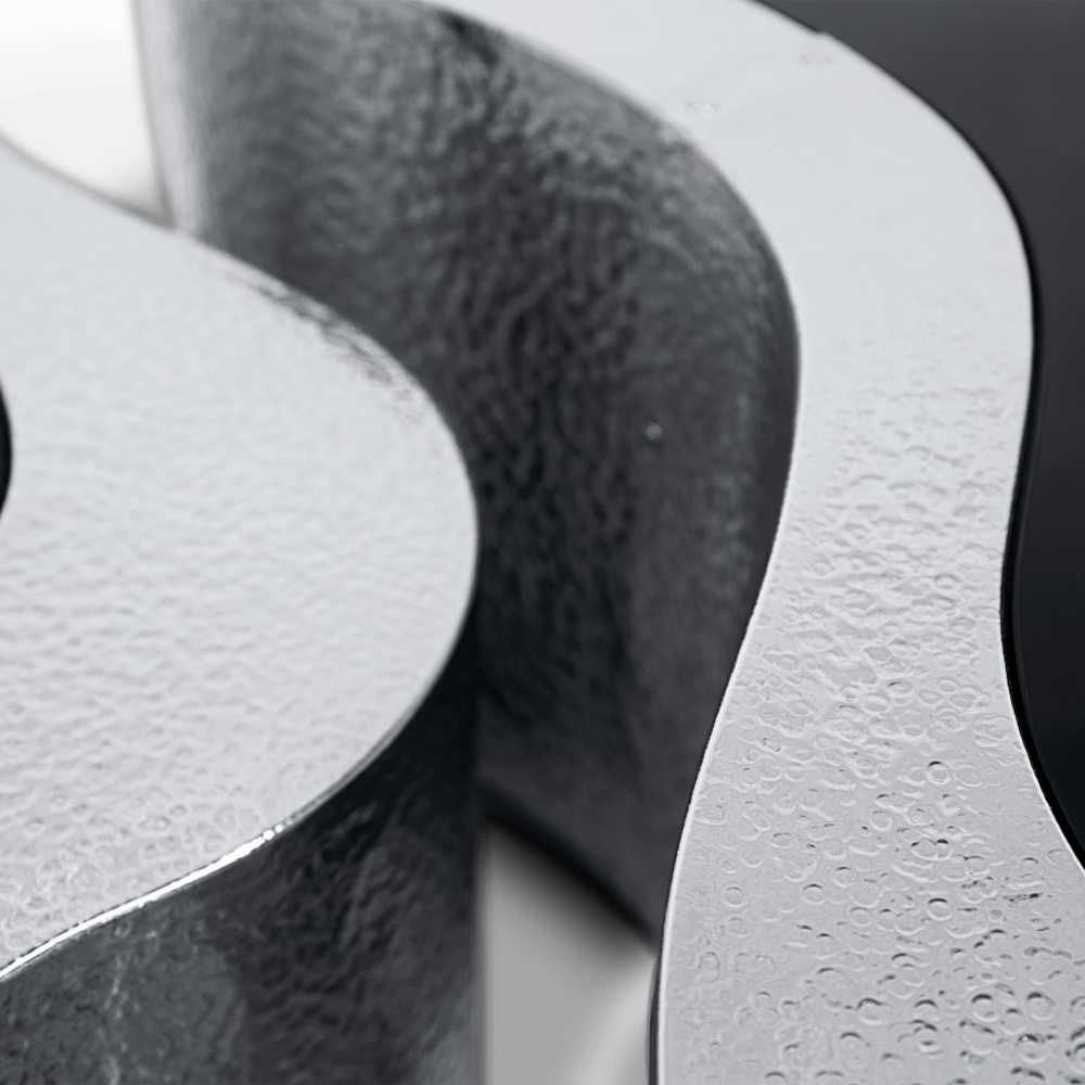 Table made in wood finished with manually hammered stainless steel, with a curvilinear top made from black mirror. The base is lacquered in black finished with a high gloss varnish.