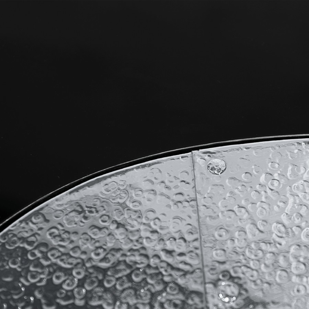 Hammered stainless steel, Glass, Wood.