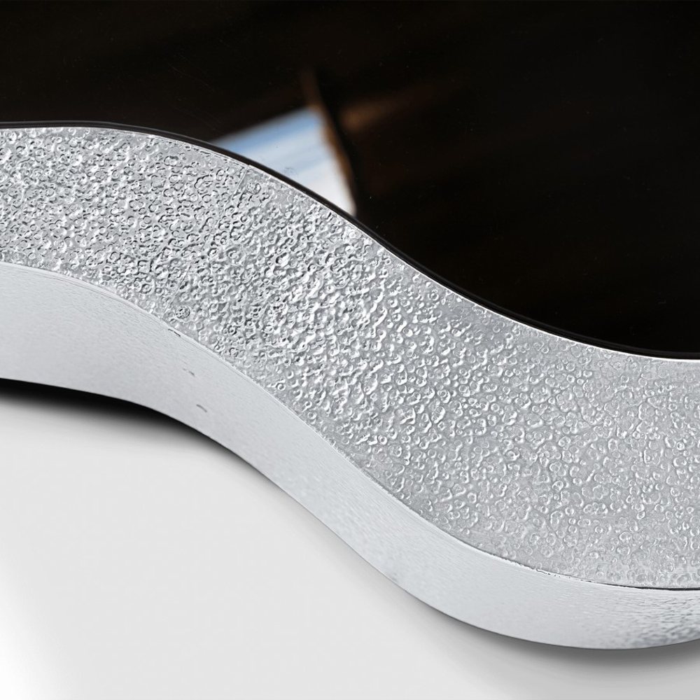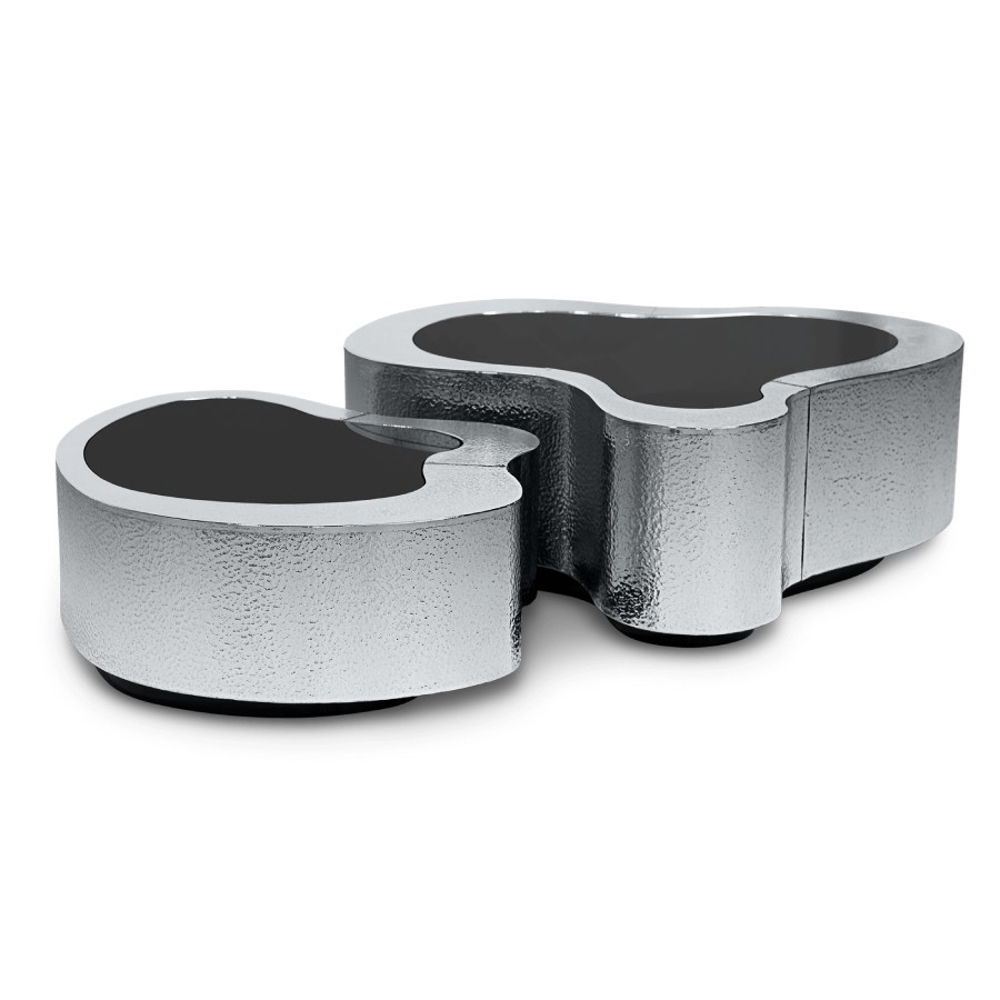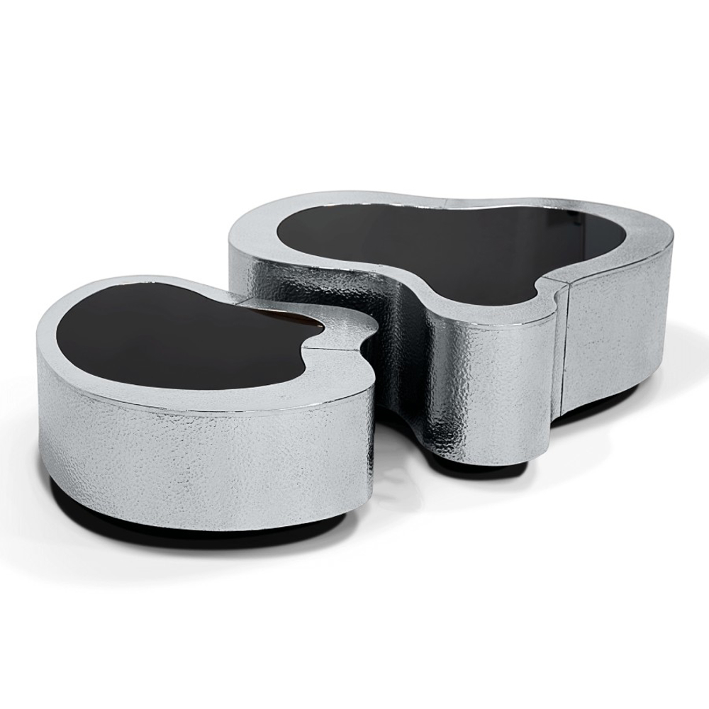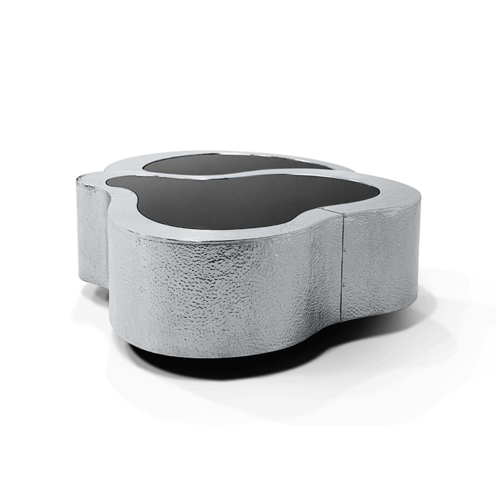 Table made in wood finished with manually hammered stainless steel, with a curvilinear top made from black mirror. The base is lacquered in black finished with a high gloss varnish.