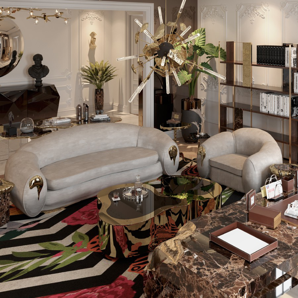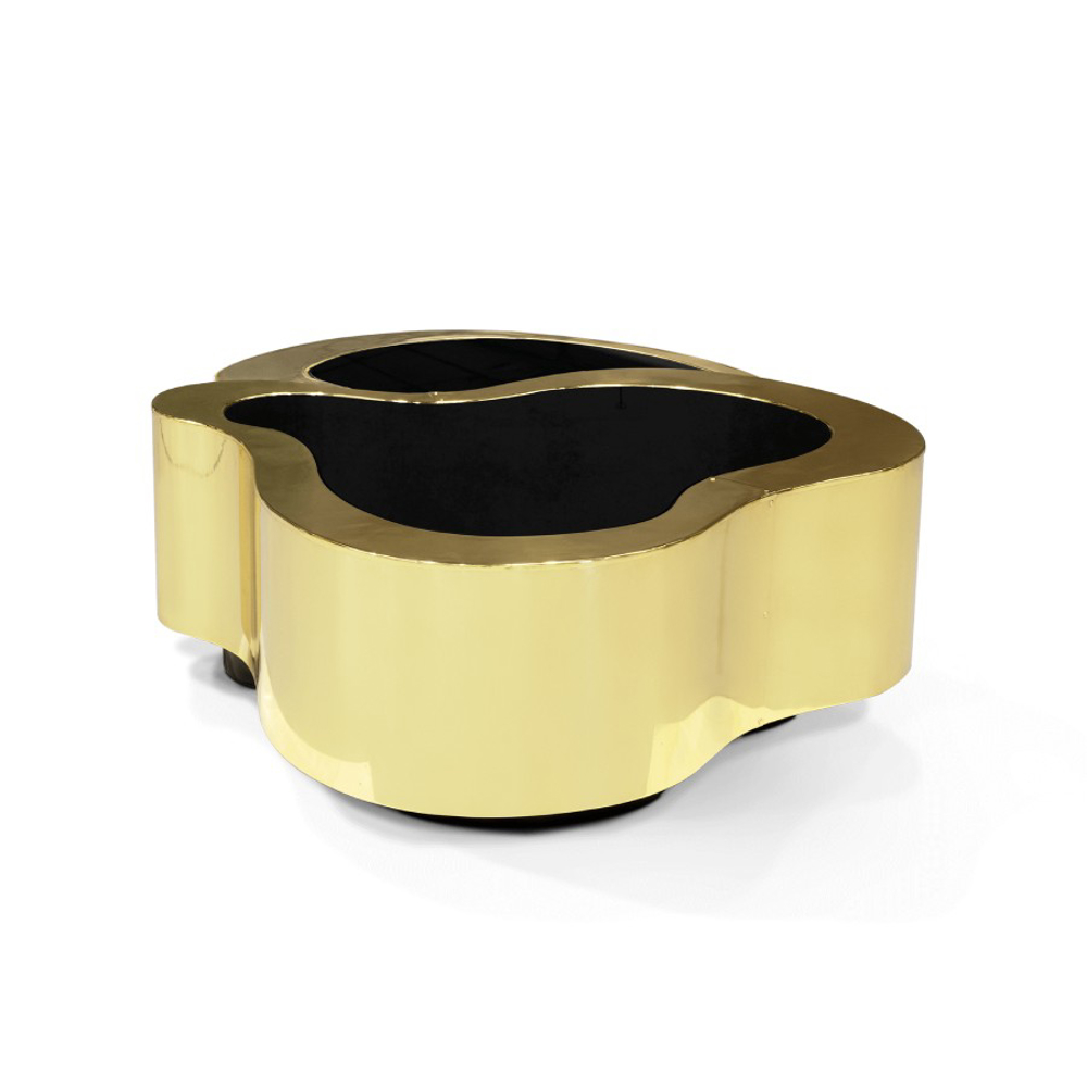 Table made in wood finished with manually polished brass, with a curvilinear top made from black mirror. The base is lacquered in black finished with a high gloss varnish.