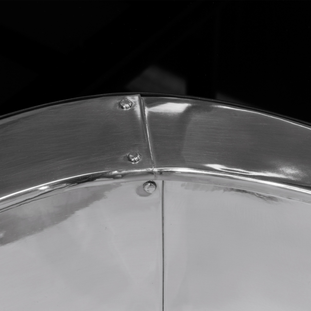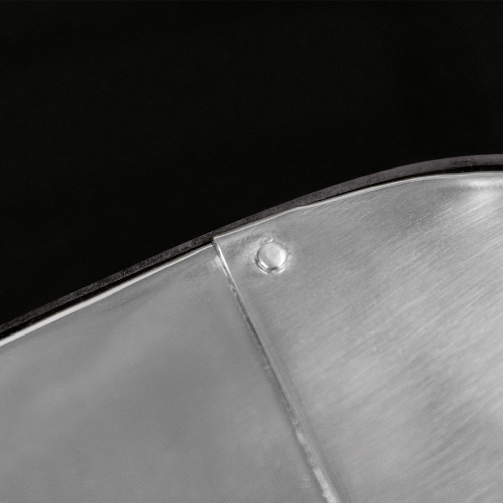 Table made in wood finished with manually polished stainless steel, with a curvilinear top made from black mirror. The base is lacquered in black finished with a high gloss varnish.