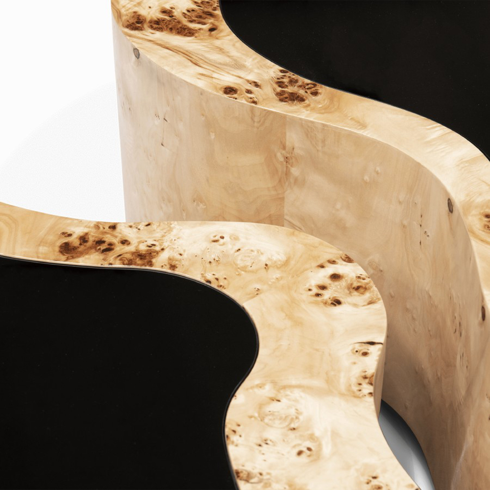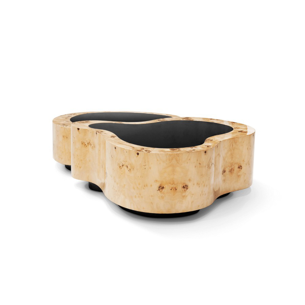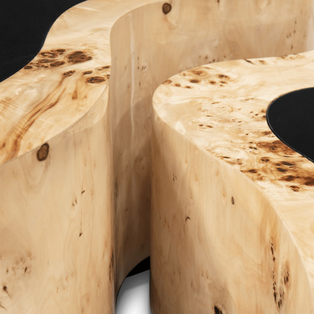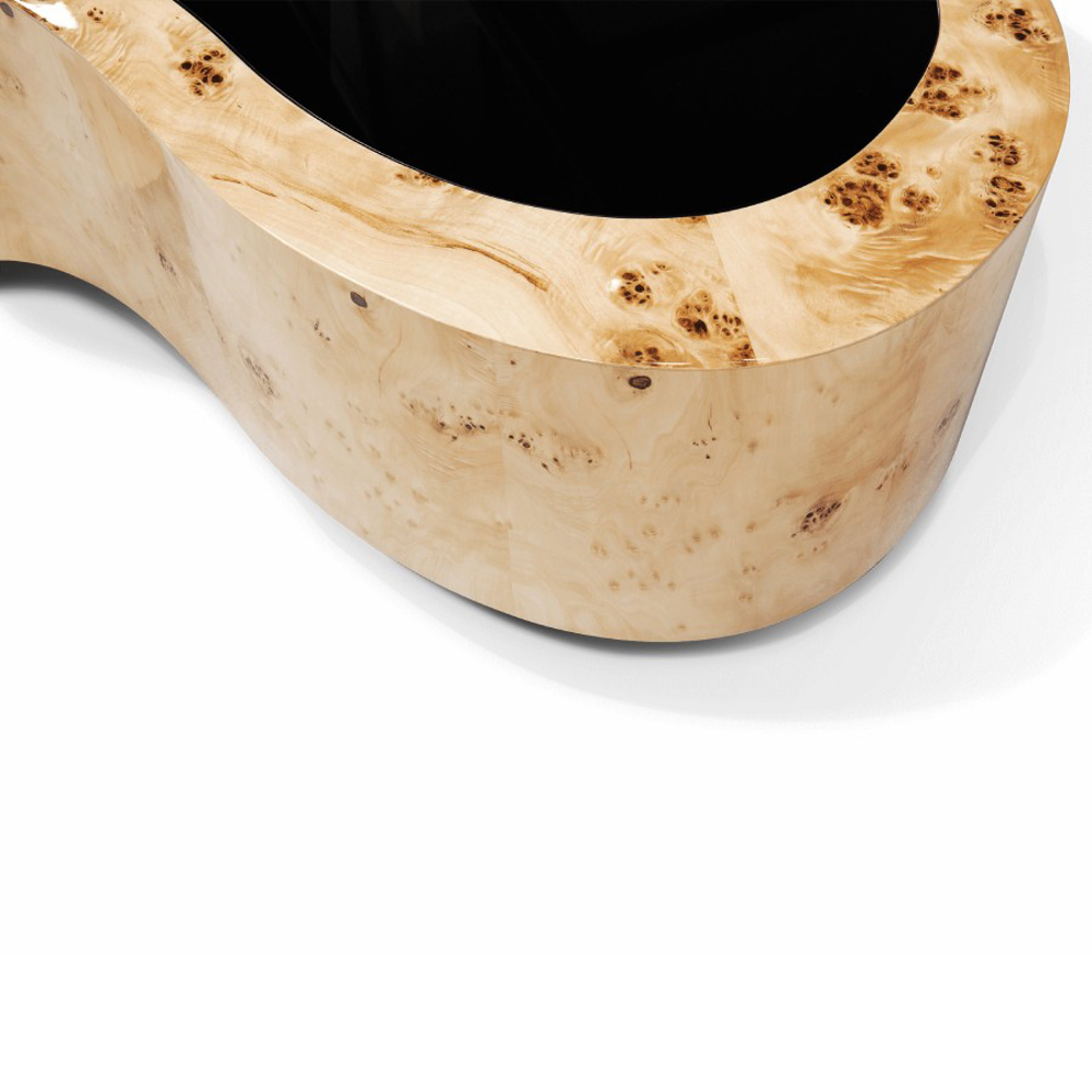Table made in wood finished with poplar root veneer, with a curvilinear top made from black lacquered glass. The base is lacquered in black finished with a high gloss varnish.