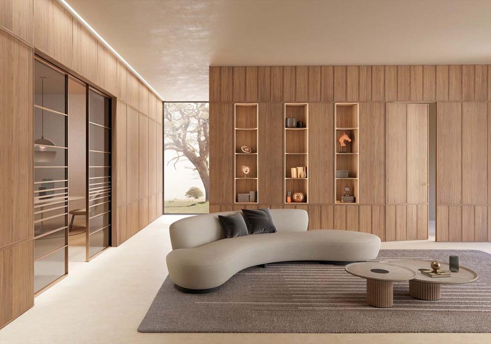 Yugen, Legnori’s new wood panelling, echoes Japanese style, in which order and cleanliness define the quality of a living space. The collection, which can be perfectly integrated with the Continuity system, is characterised by a slender border which frames the panelling and embellishes the space.